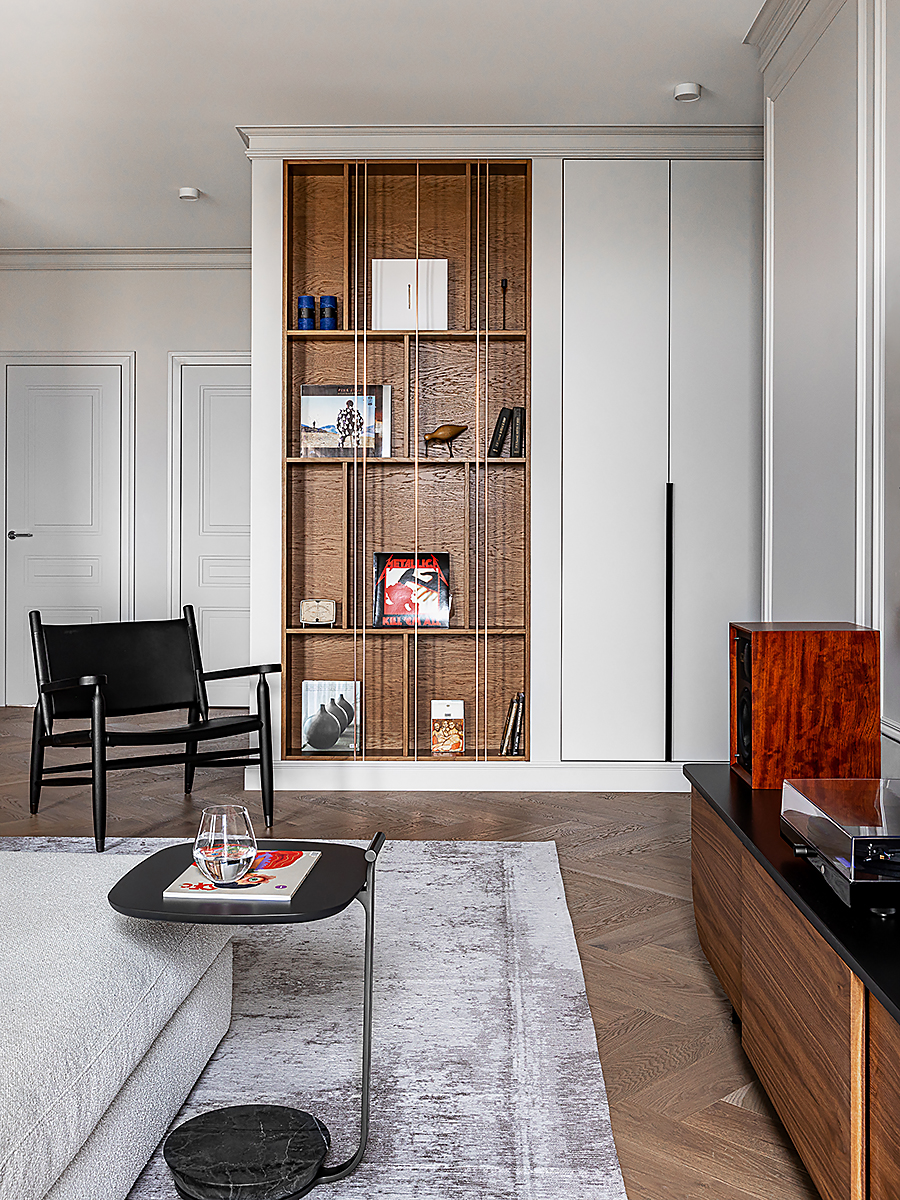 The texture of the herringbone hardwood flooring gives a difference in shade of wood, thus highlighting the floor and giving the feeling of the room’s basis; it also sets the rhythm of the interior as well as the pattern of the moldings and the verticality of the built-in furniture. This step-by-step approach is dulled and put to the background color decision. It is the deep shade that attracts attention and is dominant. The rich texture and tone of wood in the furniture is secondary to the main color. And its smooth and rounded elements add playfulness and modernity to the classics, referring to the fact that the interior was thought out specifically for a young man.