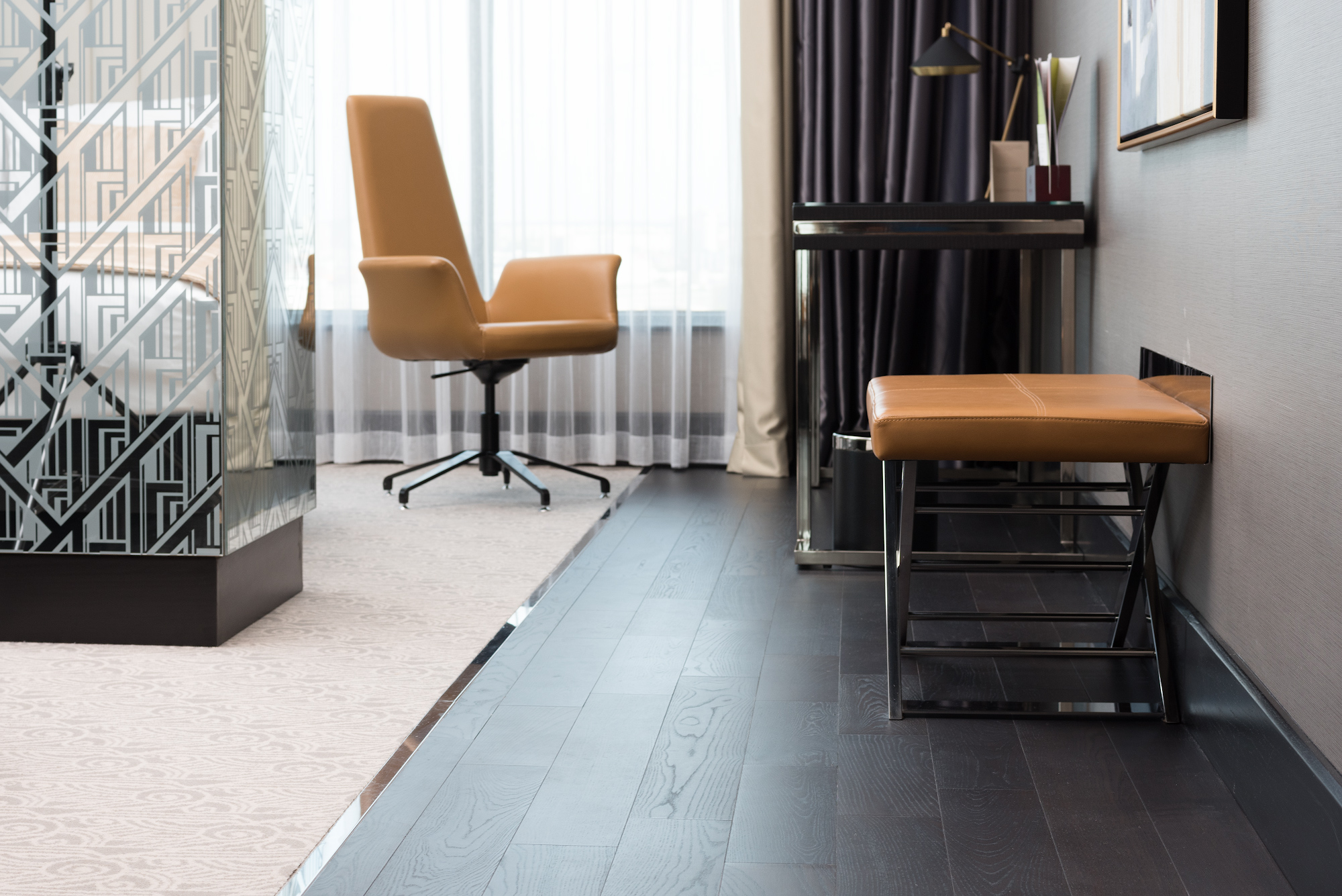 The interiors of specious rooms are based on a combination of warm shades and bright accents, clear geometric shapes and original decor elements in the art Deco style. A homely atmosphere and a comfortable rest create the use of natural materials in the decoration and natural textiles.